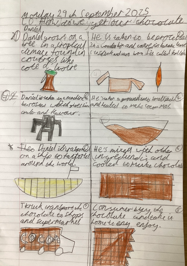 In Geography, we explored the fascinating journey of the cocoa bean – from the pod on a cocoa tree all the way to becoming the chocolate we find in shops. To show our understanding, we created our own colourful storyboards to represent each step in the process. You can see a couple of examples below!