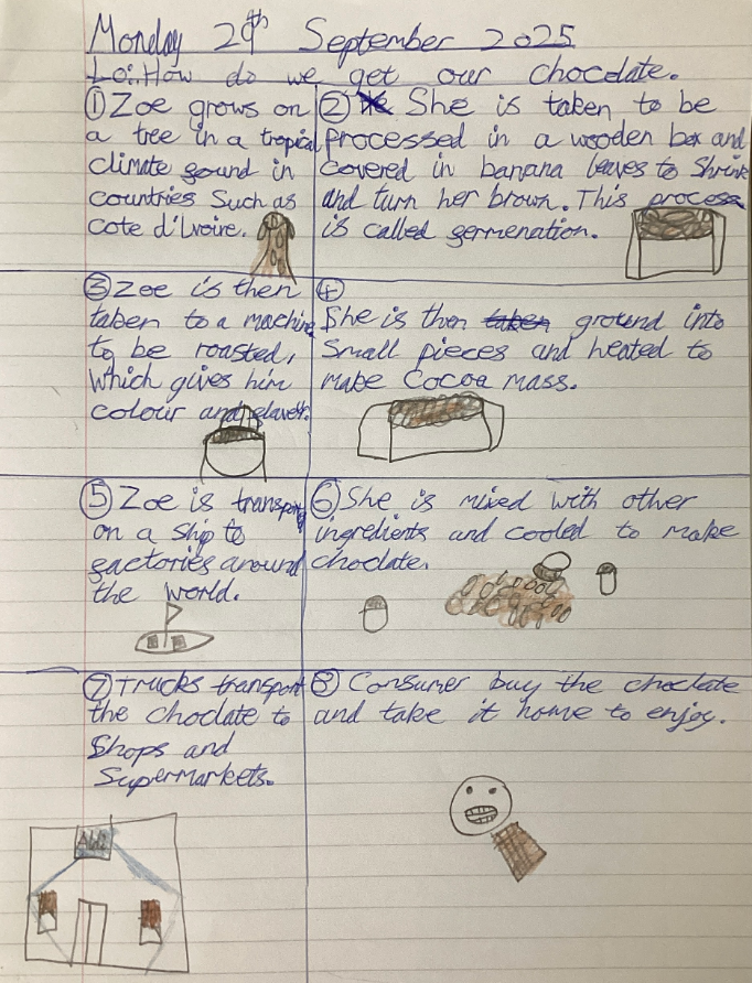 In Geography, we explored the fascinating journey of the cocoa bean – from the pod on a cocoa tree all the way to becoming the chocolate we find in shops. To show our understanding, we created our own colourful storyboards to represent each step in the process. You can see a couple of examples below!